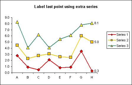 | Series 1 | Series 2 | Series 3 | Label Last 1 | Label Last 2 | Label Last 3 | 2 | A | 2.8 | 4.5 | 8.3 | =IF($A3="",B2,NA()) | =IF($A3="",C2,NA()) | =IF($A3="",D2,NA()) | 3 | B | 0.9 | 2.3 | 4.1 | =IF($A4="",B3,NA()) | =IF($A4="",C3,NA()) | =IF($A4="",D3,NA()) | 4 | C | 0.5 | 2.8 | 6.2 | =IF($A5="",B4,NA()) | =IF($A5="",C4,NA()) | =IF($A5="",D4,NA()) | 5 | D | 2.1 | 3.1 | 4.1 | =IF($A6="",B5,NA()) | =IF($A6="",C5,NA()) | =IF($A6="",D5,NA()) | 6 | E | 0.8 | 2.6 | 5.5 | =IF($A7="",B6,NA()) | =IF($A7="",C6,NA()) | =IF($A7="",D6,NA()) | 7 | F | 0.9 | 2.5 | 6.1 | =IF($A8="",B7,NA()) | =IF($A8="",C7,NA()) | =IF($A8="",D7,NA()) | 8 | G | 3.5 | 6 | 7.8 | =IF($A9="",B8,NA()) | =IF($A9="",C8,NA()) | =IF($A9="",D8,NA()) | 9 | H | 0.3 | 5 | 8.1 | =IF($A10="",B9,NA()) | =IF($A10="",C9,NA()) | =IF($A10="",D9,NA()) | 10 | | | | | | | | Utwórz wykres korzystając z kreatora opierając się na zakresie A1:G9  Wybierz czwartą serię danych (w naszym przykładzie nazwaną 'Label Last 1', zwróć uwagę, że nazwa ta zależy od nazwy umieszczonej w pierwszym wierszu nad daną kolumną) u sformatuj tę serię tak aby zarówno obramowanie jak i wypełnienie znacznika serii było typu "żaden".Jednocześnie zaznacz opcję wyświetlania etykietek.Powtórz tę operację dla piątej i szóstej serii.  Sformatuj obszar wykresu tak jak lubisz. Tutaj usunęliśmy tło, linie siatki i obramowanie,