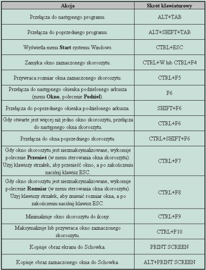 Interfejs Excela (czyli to co użytkownik widzi Uruchamiając program) zawiera szereg możliwości ustawień, z których to możliwości warto, należy a niekiedy trzeba korzystać! I znowu część z opcji wymaga czasami wykonania przy pomocy myszki kilkunastu ruchów/kliknięć. Przydatność tych skrótów trudno mi ocenić zależy to bowiem od osobistych preferencji i konkretnego najczęściej stosowanego wykonywania zadań. Faktem jednak jest, że po ustaleniu pewnego stałego repertuaru skrótów umożliwiają one znaczne przyspieszenie pracy. Poniżej zamieszczono obraz tabelki ze skrótami klawiaturowymi dotyczącymi interfejsu programu czyli głównie zarządzania oknami otwieranymi z poziomu Excela.