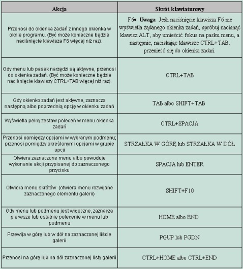 Dla tej grupy istotne są poniżej opisane skróty klawiaturowe: